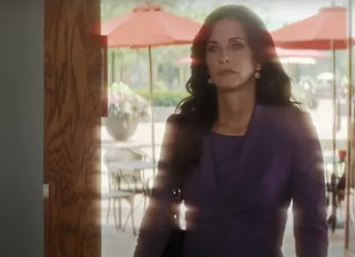 - Wide shot of Campbell walking alone outside, killer runs past in the background